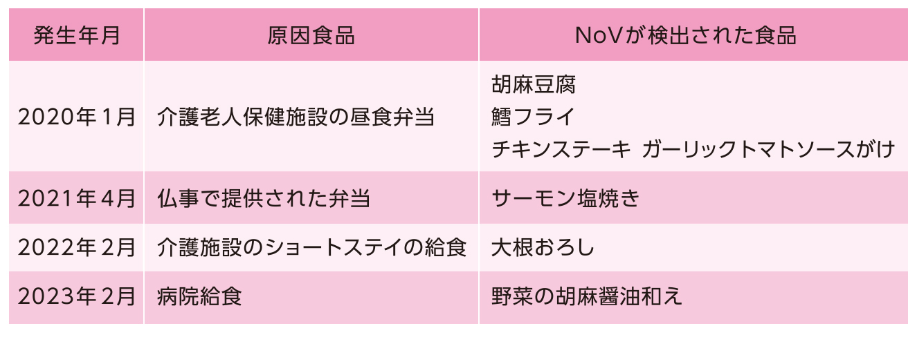 厚生労働省作成の大量調理施設衛生管理マニュアルでは、NoVによる食中毒対策として85~90℃で90秒以上の加熱調理を求めており、一般の飲食店等においても加熱調理をしっかりと行えば食中毒を防げるとの認識が浸透している。ところが、加熱だけに注意が向けられるようでは対策として不十分である。近年は、パンソルビン・トラップ法のような食品中のウイルスを検出する技術が開発されて、実際の汚染状況がわかるようになってきた。次の表は当センターで扱った食中毒事例で、どのような食品からNoVが検出されたかを示したものである。大根おろし以外は、十分に加熱調理された食品である。他の機関からの報告でも、“そら豆の煮物”、“焼き魚”、“唐揚げ”、“学校給食のパン”等、加熱調理済みの食品からNoVが検出されている。