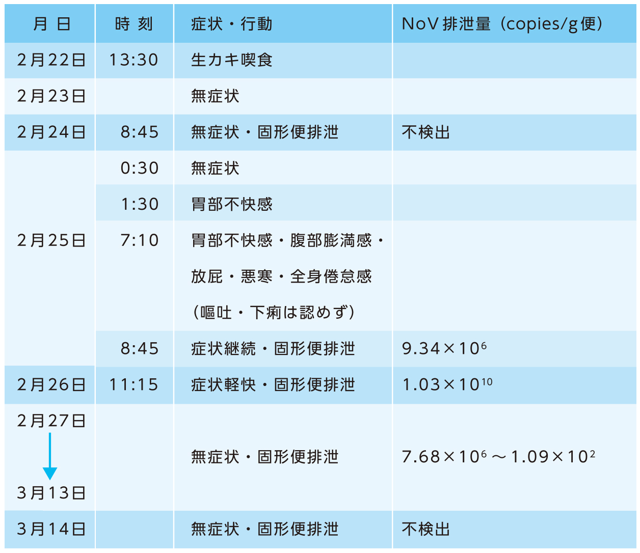 NoVに感染すると激しい嘔吐と下痢が起こるものと一般には認識されているが、その症状だけを指標にして食品取扱者の健康チェックを行うのは対策として不十分である。次の表は2016年に当センターで経験したある成人の症例経過を示したものであるが、カキを生食した60時間後に、胃部不快感が出現したものの、嘔吐・下痢はなく、1日後に症状としては回復した。ところが、NoVの排泄は18日間継続した。こうした軽症の成人感染者が医療機関を受診するとは考えにくく、その軽い症状も速やかに消失していることから、何ら気にすることもなく仕事に従事していたものと思われる。本症例は胃部不快感だけで嘔吐・下痢はなく、むしろ便秘とガス貯留が主訴となったことから、形式的な健康チェックでは見逃される可能性が高い。