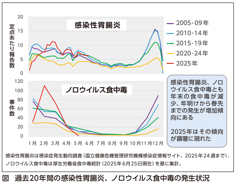 不顕性感染者の発見等を目的としたノロウイルス検便検査は、10~3月に推奨されている。しかし、近年の流行状況を見ると、年末の流行は減少し、1~2月をピークに春から初夏まで継続する傾向がある(図)。民間検査機関((株)町田予防衛生研究所)の検査によると、陽性率は1~2月と、検査推奨期間を過ぎた4~6月にも高い傾向を示している。このため、検便検査は流行状況を踏まえて実施することが望ましい。また、陰性確認後に再陽性となる事例もみられる。マニュアルにもあるように、「検査結果が陰性であっても、検査感度によりノロウイルスを保有している可能性を踏まえた衛生管理が必要である」ことを理解し、一定期間は衛生管理をより徹底することが重要である。